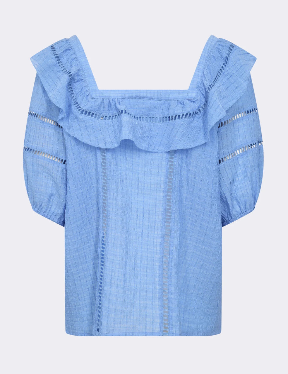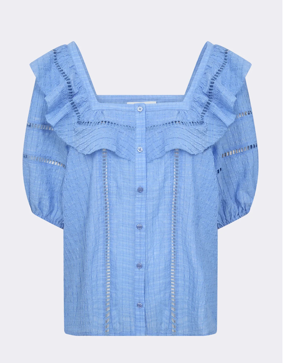 Dette plagget har en firkantet hals med volangdetaljer, 3/4-ermer, knappelukking og det er detaljert med rader med sømmer. Designet for ulike anledninger, par denne toppen med skreddersydde bukser eller en denim for et elegant utseende.