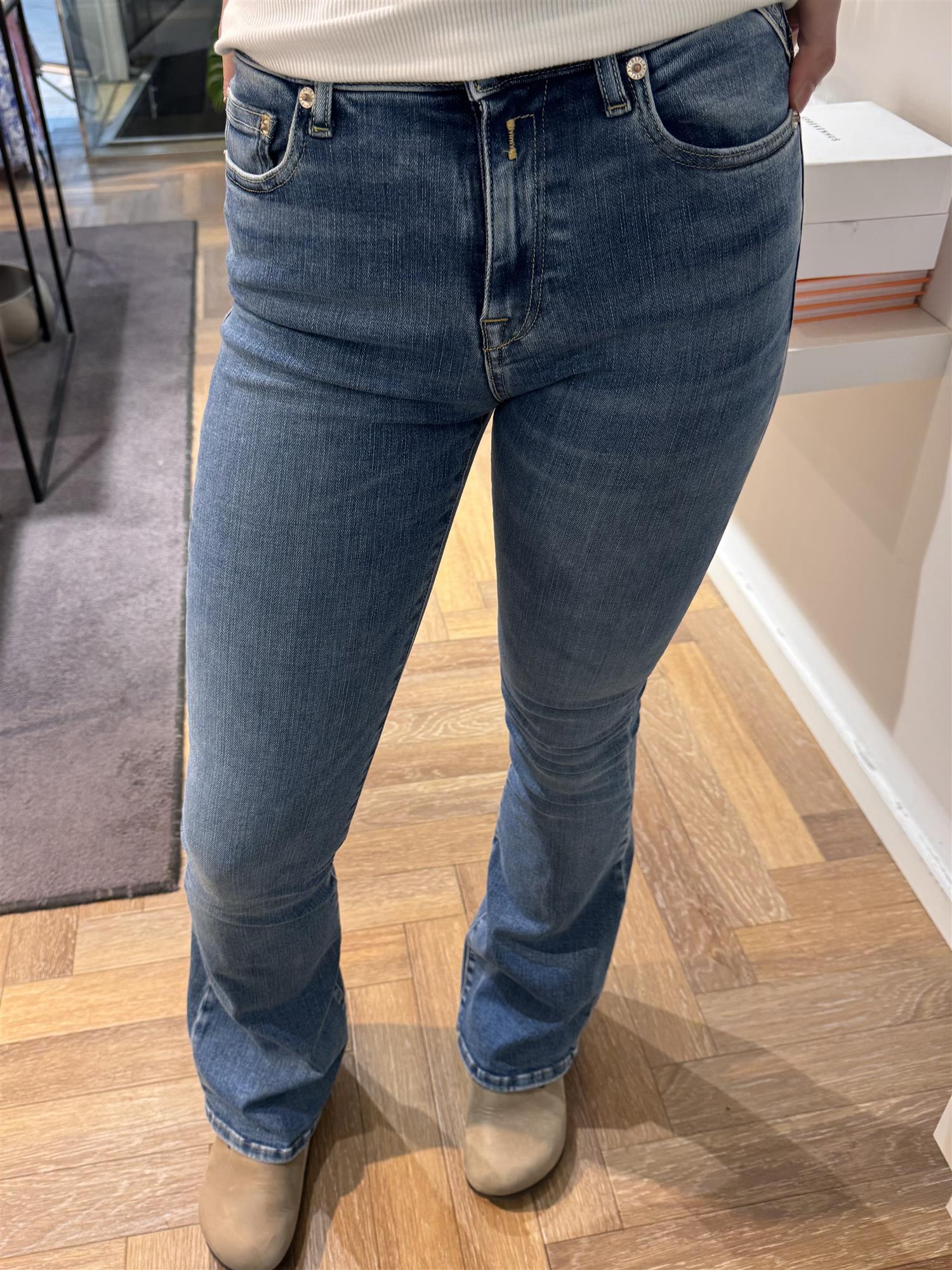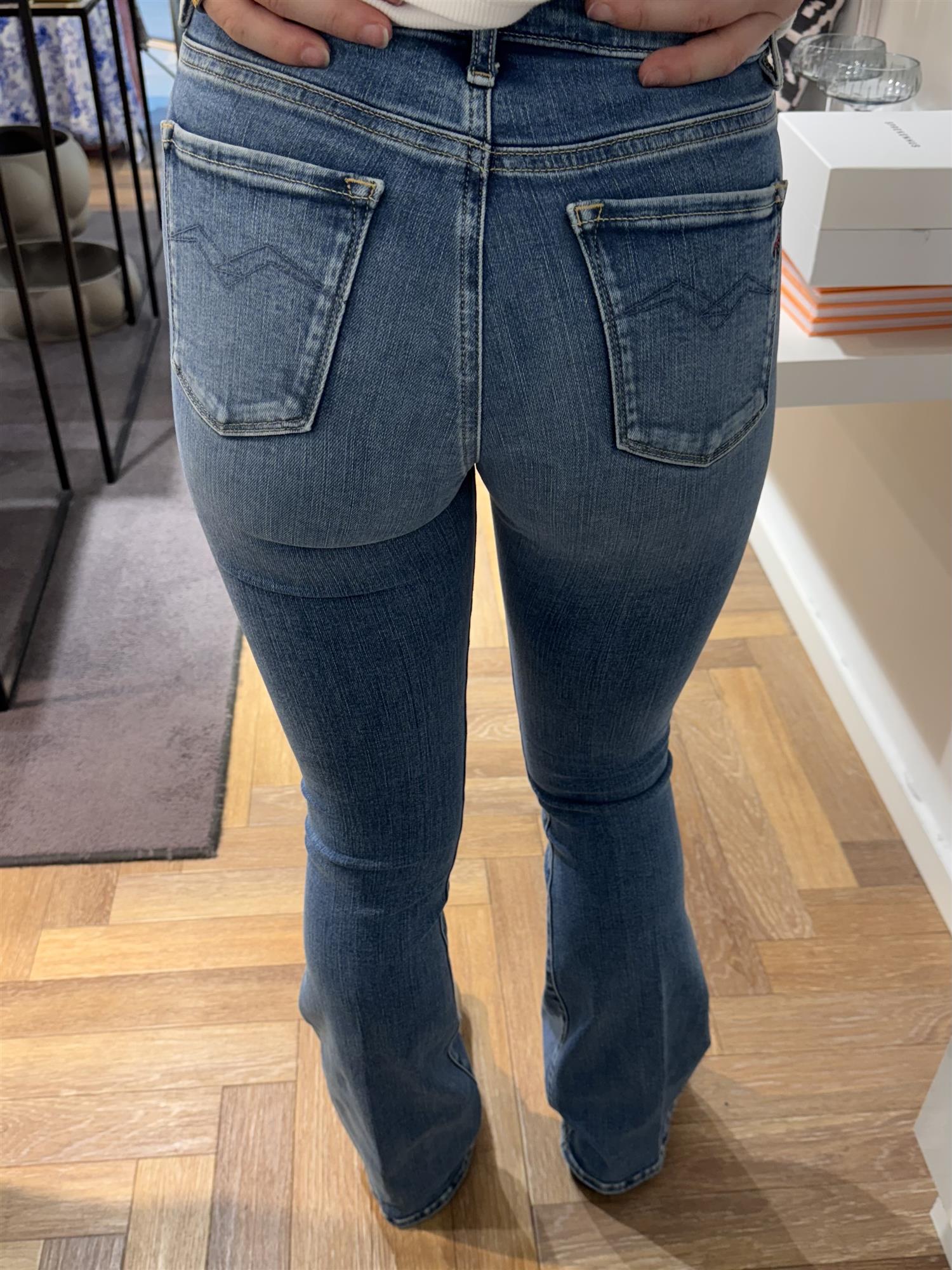 Joella jeans fra Replay med mid-til-høy midje. De har en tettsittende og flatterende passform fra midjen til knærne, og går ut i sleng fra knærne og ned. Fullført med den ikoniske gullvingesømmen på baklommene.