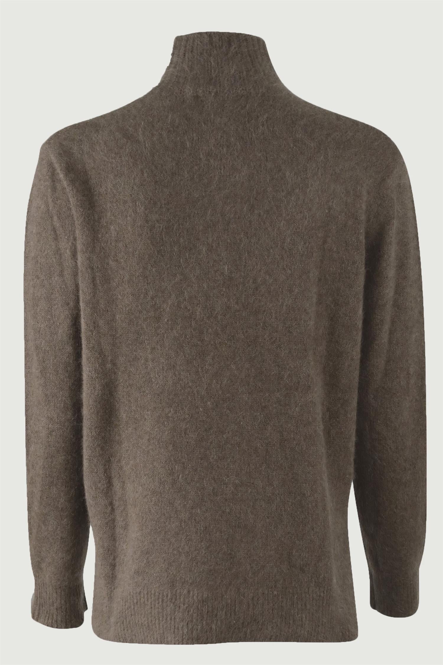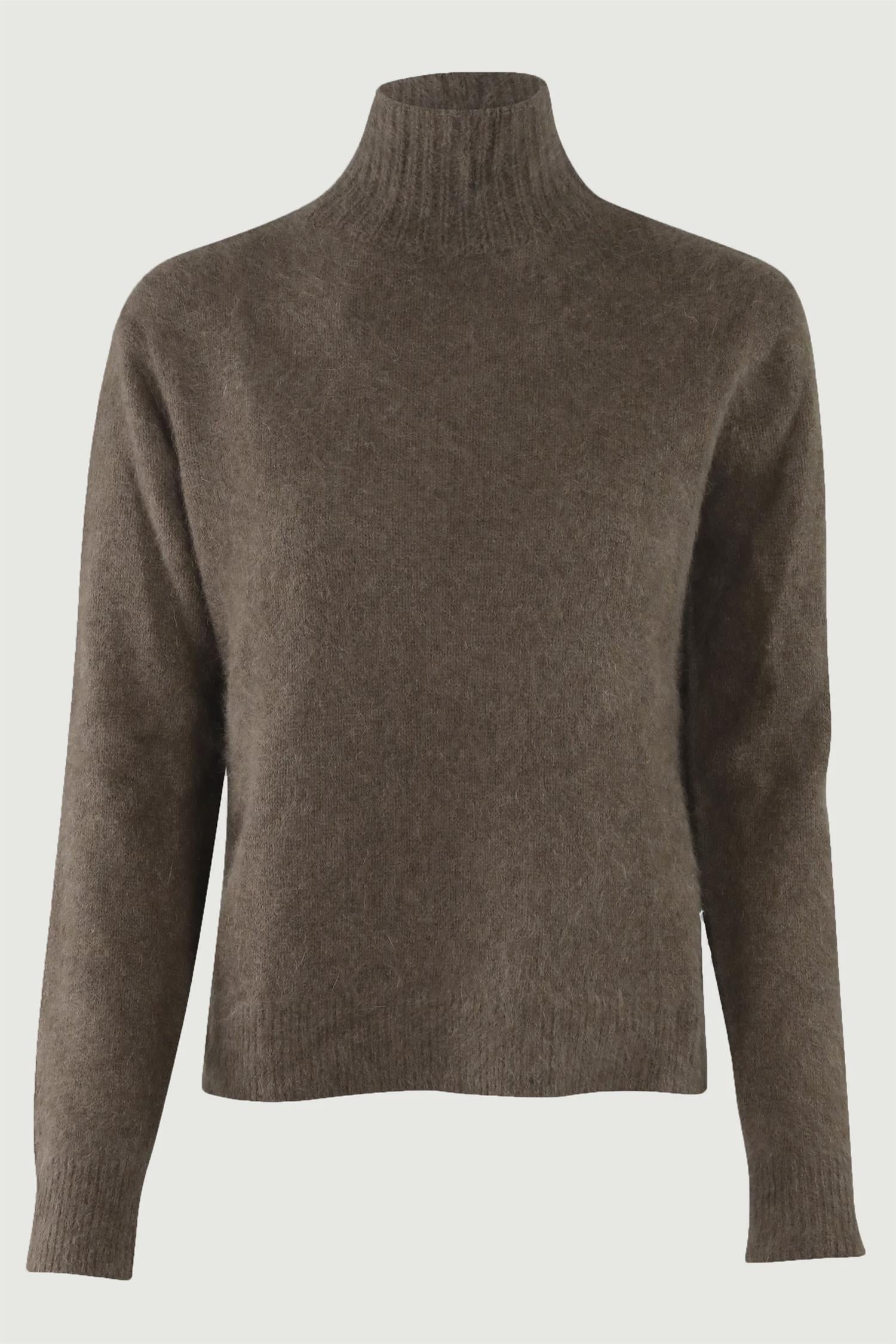 Jade fra Six Ames i 100% racoon-ull. Genseren har høy hals og en liten split på hver side.
