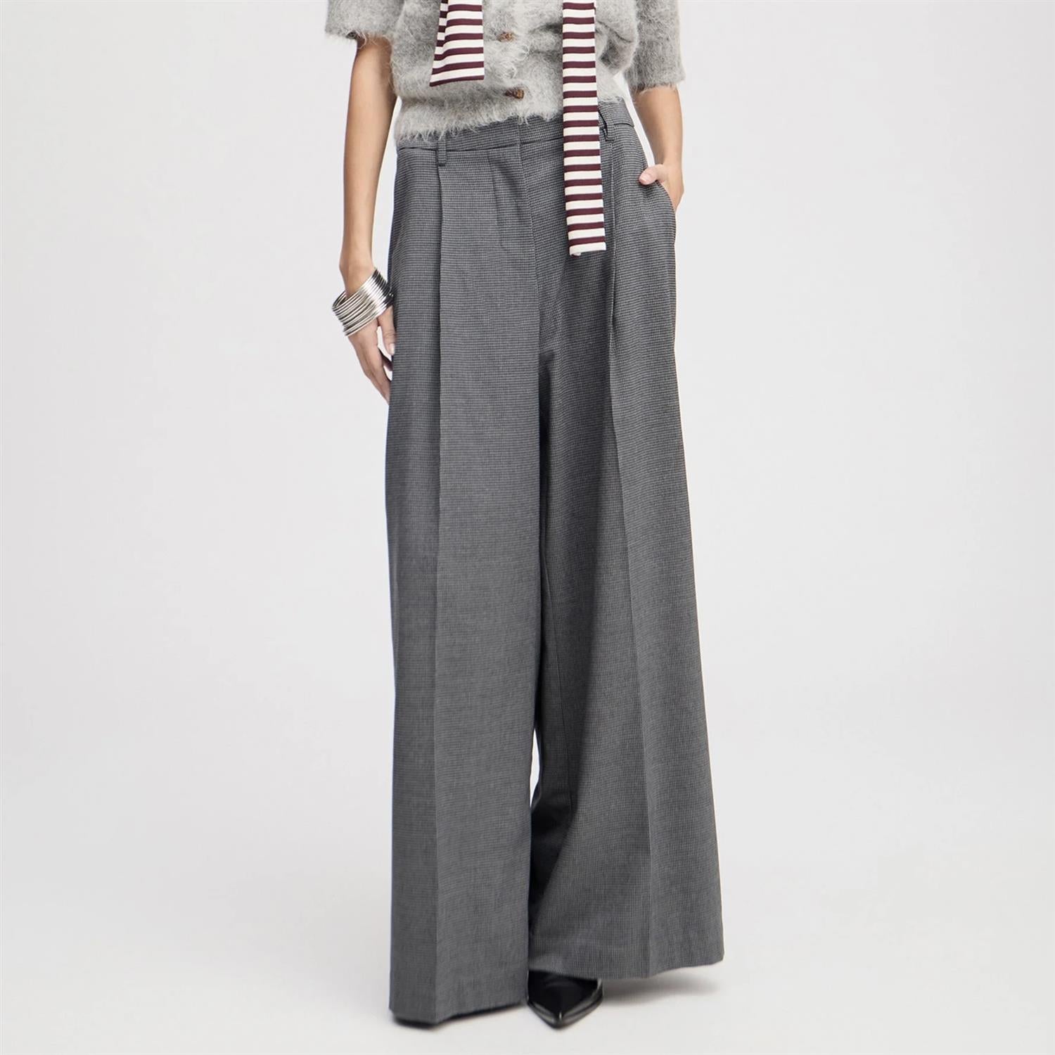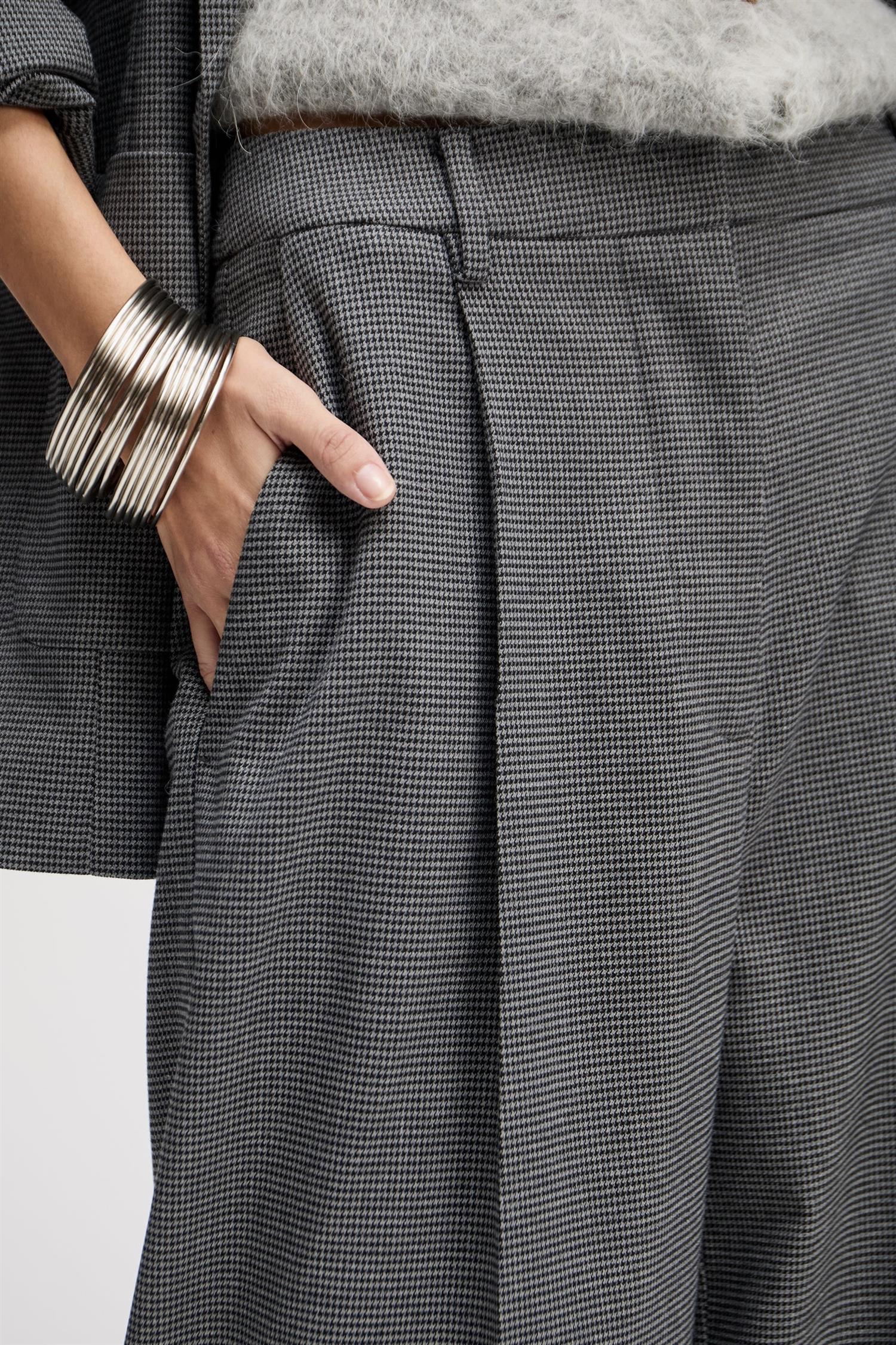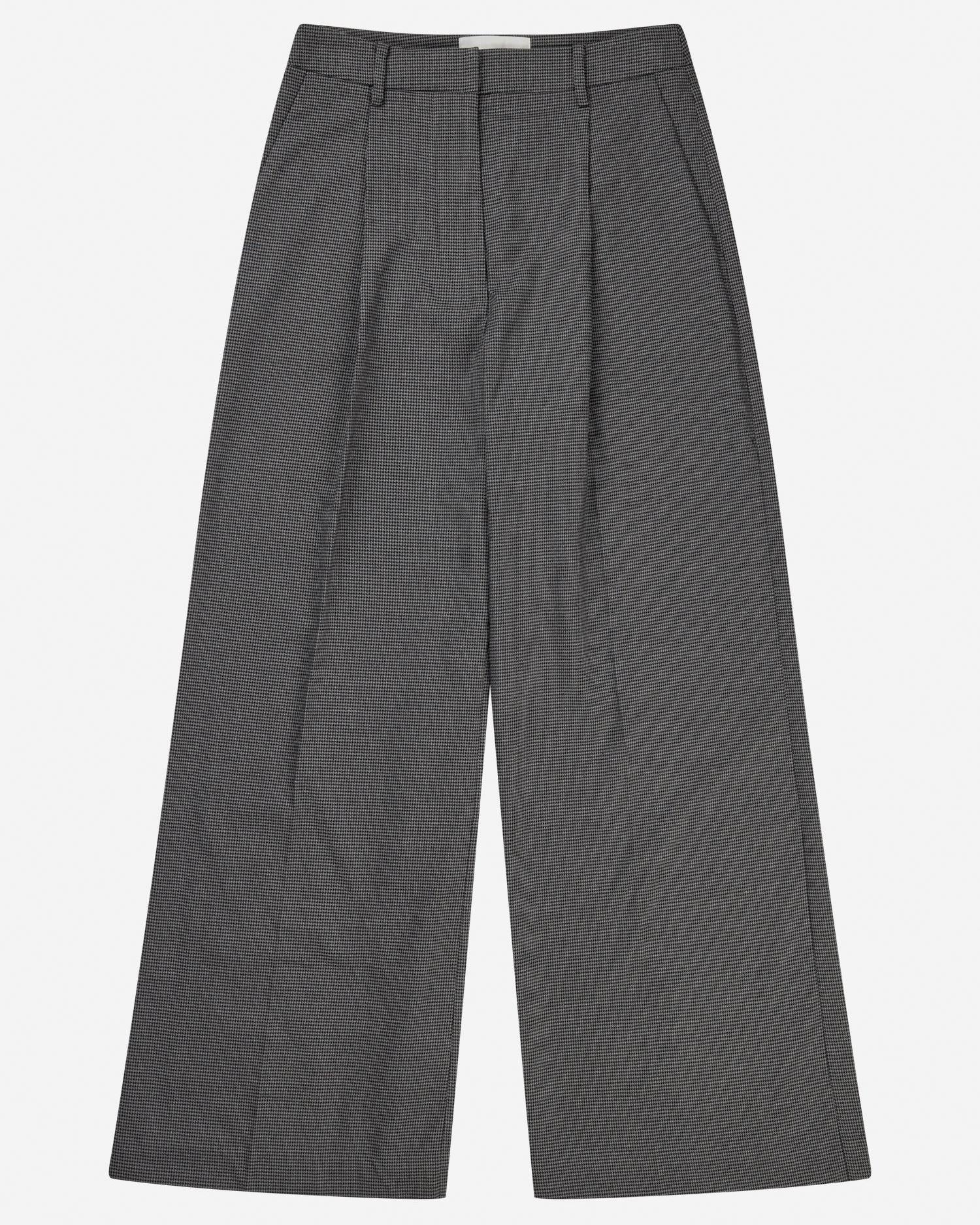 Vakre rutete bukser med vide ben og elegante detaljer som beltehemper, legg og sidelommer. Buksene lukkes foran med glidelås.