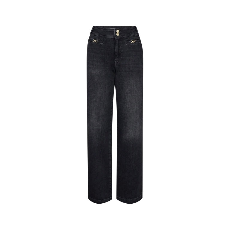 Disse stilige jeansene med høy midje er laget i en flatterende, vid passform, som kombinerer komfort med uanstrengt sofistikasjon. De subtile, glamourøse detaljene på lommene foran gir et hint av glitter og løfter designet med et snev av eleganse. Bruk dem med en elegant bluse eller en koselig strikkegenser for et allsidig og uanstrengt elegant antrekk.