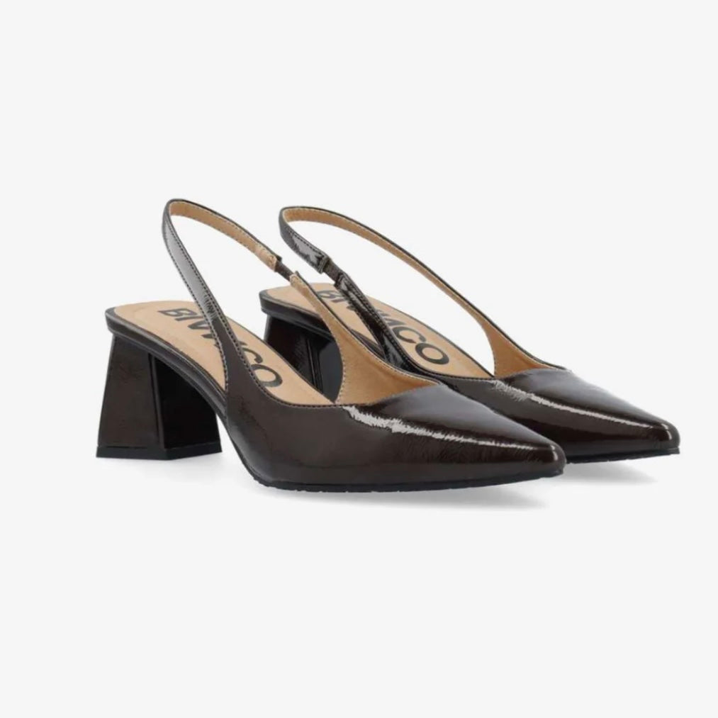 Maralyn Slingback Patent fra Bianco er elegante og klassiske pumps i patent skinn. Skoene har spiss tå, komfortabel blokkhæl og elastisk slingback stropp bak på hælen. Perfekt til sesongens festlige anledninger.