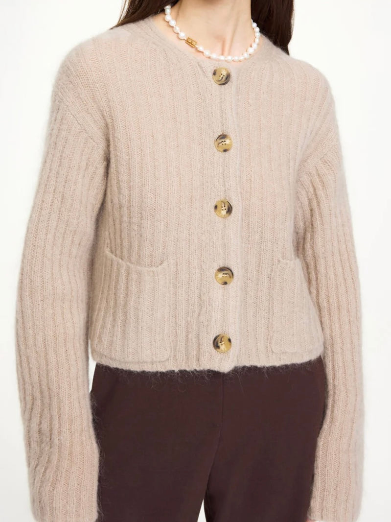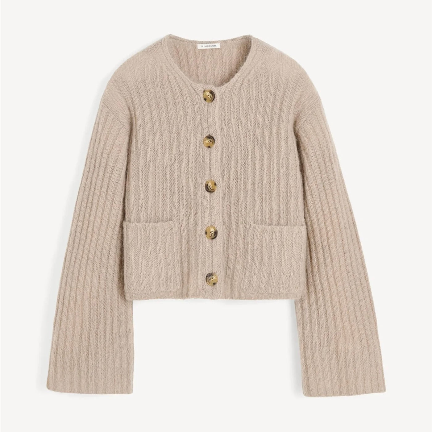 CIERROU er en lekker, ribbestrikket cardigan med lommer og synlige knapper i front og knapper nederst på ermene. Knepper du ikke igjen knappene nederst på ermene, så har den lekre trompet armer. Cardiganen er cropped i lengden med en noe firkantet passform.