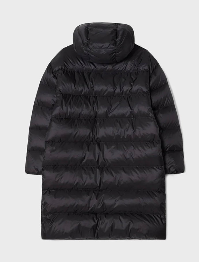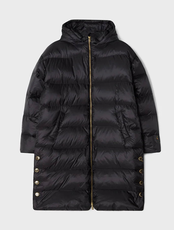 Farida dunjakke er laget av resirkulert nylonstoff fylt med dun for å holde deg varm, og stoffet er vannavvisende. Denne jakken har en hette som kan tas av takket være trykknappene. Den er detaljert med glidelås, to paspolerte lommer og fire gylne B-trykknapper på hver side. Den litt overdimensjonerte passformen gjør den enkel å bruke over tykke gensere.