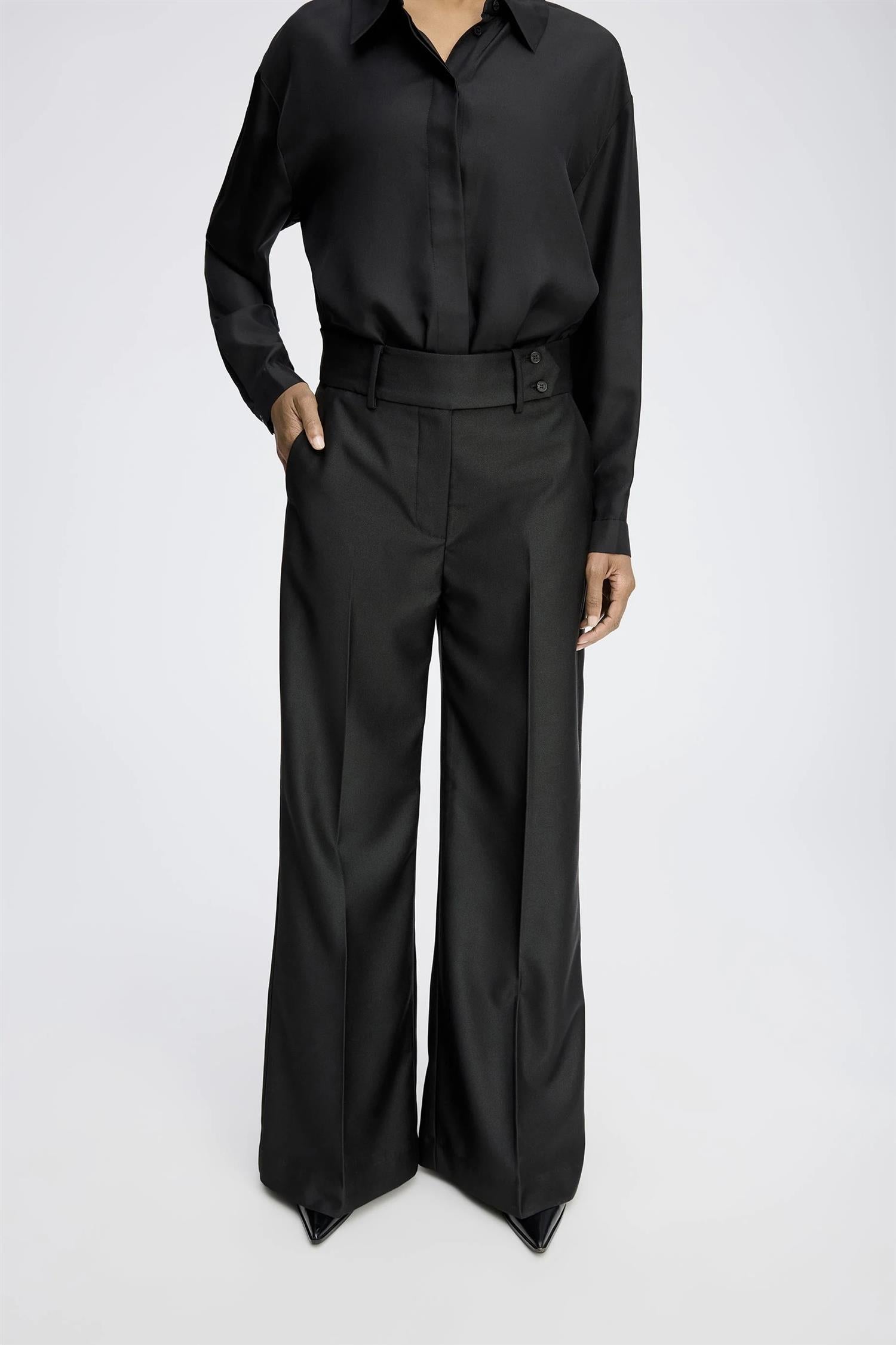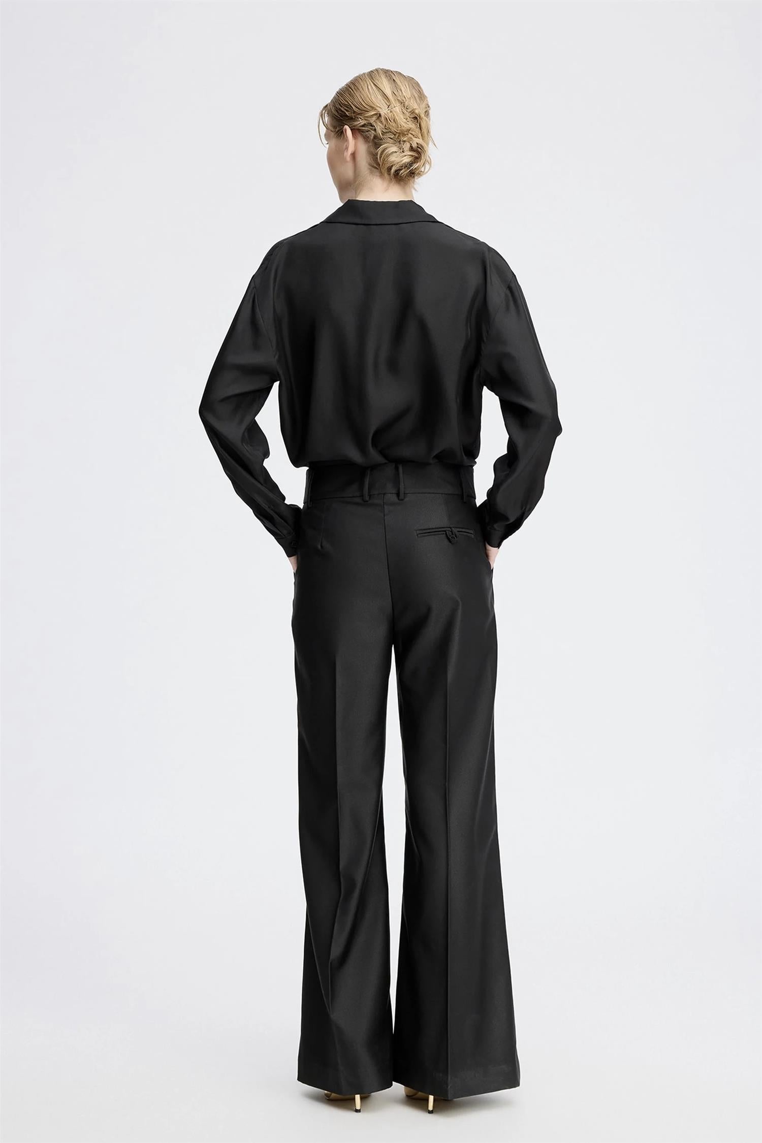 Elegante bukser med vide ben og fine trykkfolder. Disse buksene er designet med beltehemper, lommer og en vakker knappelukking i midjen.