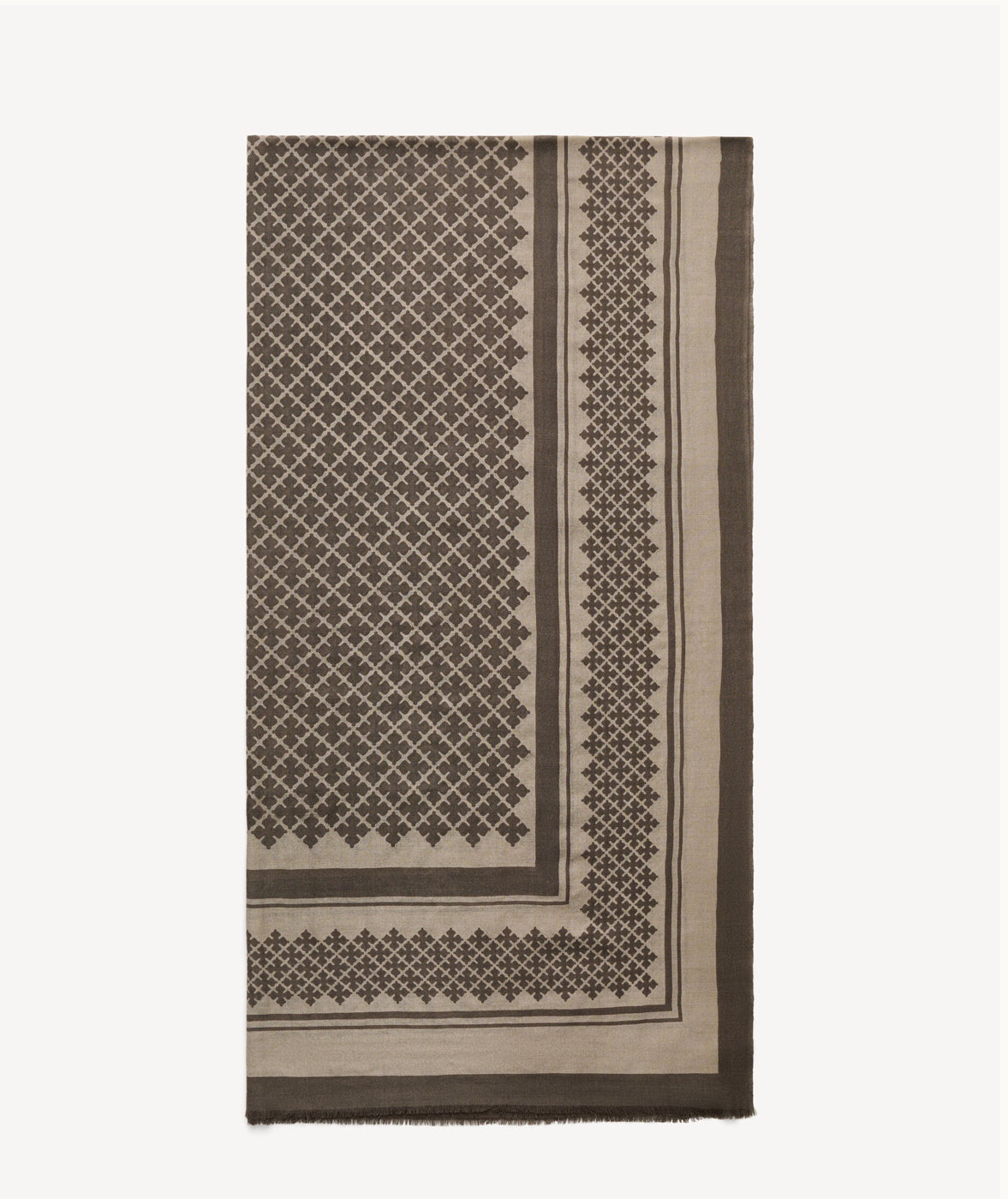 By Malene Birgers Julee-skjerf er laget av luksuriøs ull. Den rektangulære silhuetten er utsmykket med Signature Flower-trykket og plysjfrynser. Draper det over en ullfrakk gjennom hele sesongen.