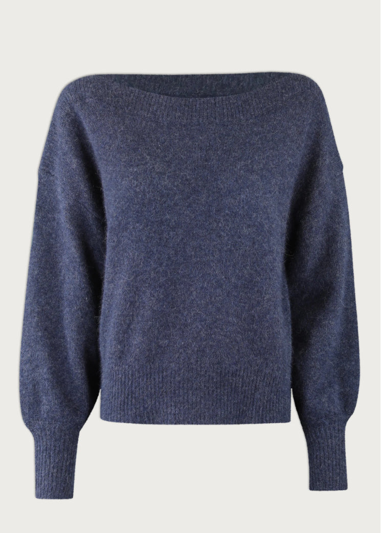 Malou er en genser i normal passform i 100 % ultramyk vaskebjørnull. Den har båthals, lav skulder og lange ermer, med fin ribbekant langs halsen og skuldersømmene, og litt bredere ribbekanter ved mansjettene og falden. Den litt avkortede lengden gir et moderne og elegant preg.