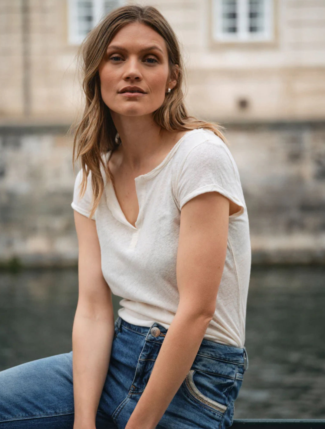 Du kan alltid bruke en velsittende t-skjorte i garderoben din. Denne er smal i fasongen og har en feminin knappestolpe i kontraststoff. Vi har laget den i en behagelig blanding av bomull og lin, og gitt den kule oppbrettbare ermer. Du kan bruke den til alt, men vi elsker den sammen med jeans.