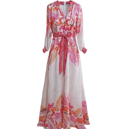 Belize kjolen i lang er en nydelig maxi-kjole fra Hale Bob laget i deilig vasket lin. Kjolen har en høy, smocket hals, som kan kneppes opp til en delikat v-hals, voluminøse ermer med brede mansjetter og en dekorativ knappestolpe kantet med vakkert broderi. Kjolen har praktiske sidelommer og et avtagbart knyte-belte, som er med på å gi en feminin silhuett.
