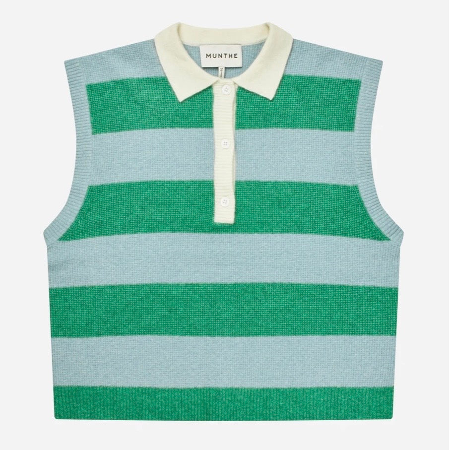Ermeløs strikket topp med brede horisontale striper. Designet med kontrastkrage og knappedetaljer. Silhuetten gjør den egnet både for lag-på-lag-bruk og alene.