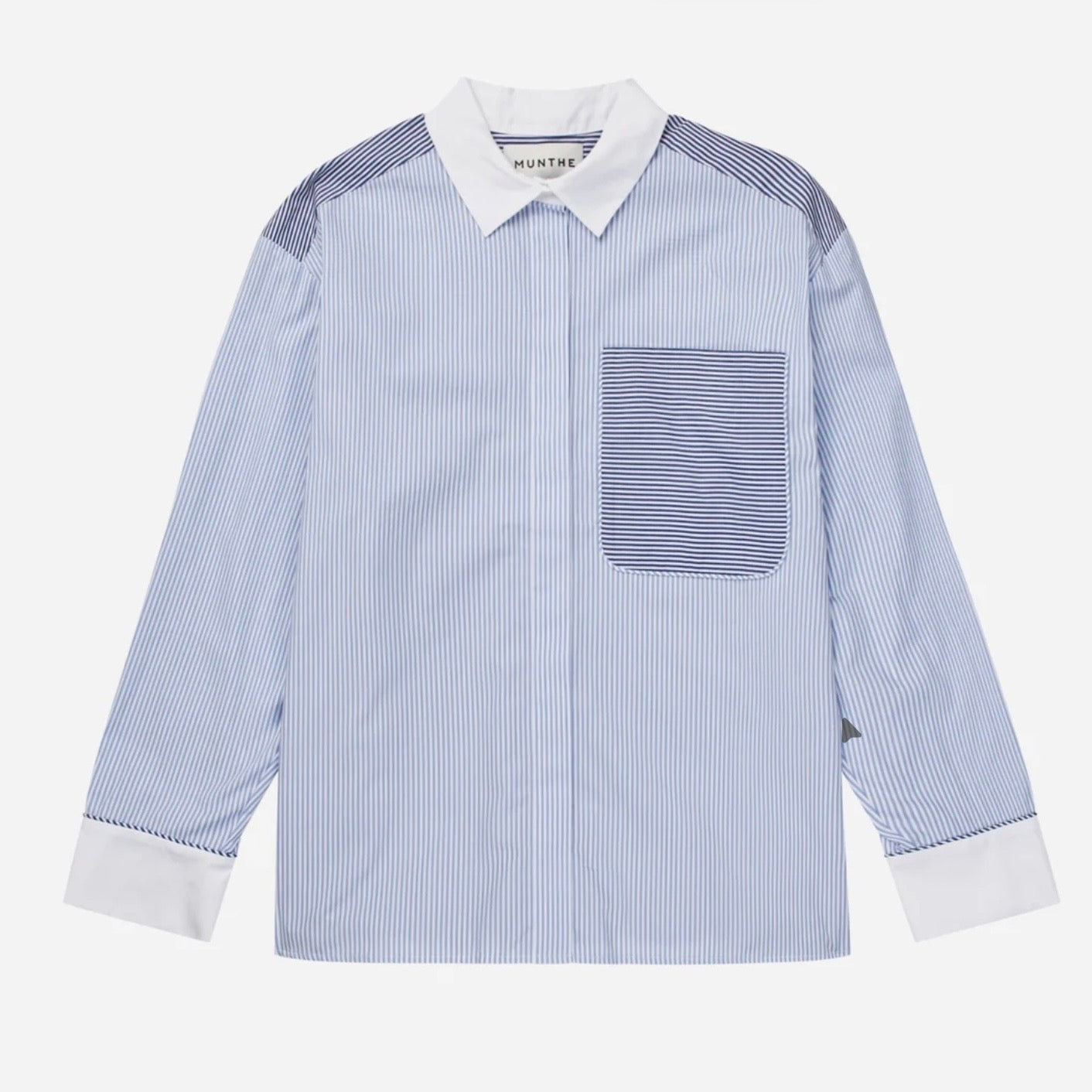 Stripete skjorte med kontrasterende hvit krage og brystlomme og skulderpaneler i matchende stripete mønster. Den har lange ermer med hvite mansjetter, skjult knappelukking og en løs passform.