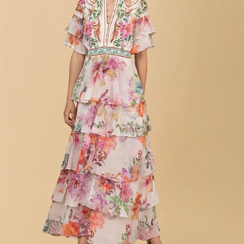 Elegant og feminin kjole fra Hale Bob, laget i lett og behagelig kvalitet og helt foret for optimal komfort. Kjolen har en dekorativ smock-krage med knapper i front og smock-linning som gir en flatterende passform. De lagdelte flutter-ermene tilfører et romantisk uttrykk, mens det lagdelte volangskjørtet med splitt foran gir fin bevegelse og en sofistikert finish.
