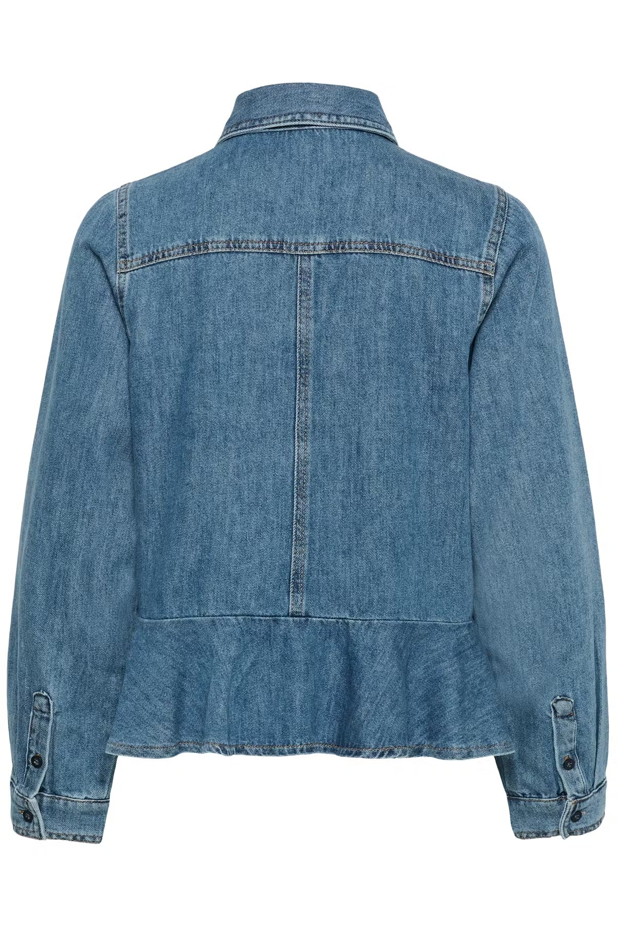 Denimjakke med peplumkant, rett passform og klassisk skjortekrage. Vertikale sømdetaljer og lange ermer gir et stilrent deniminntrykk.