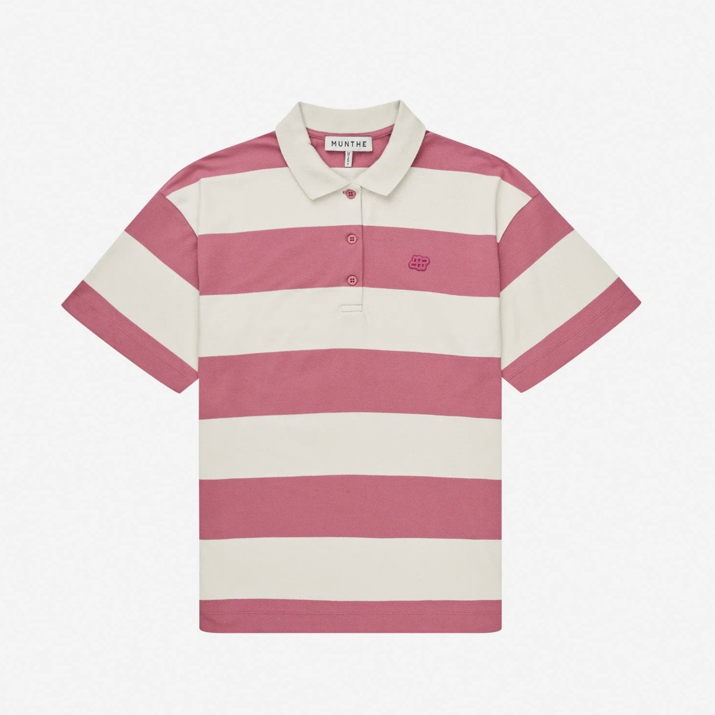 Polo-t-skjorte med striper, hvit krage og knappedetaljer. Den har korte ermer, rund hals, et diskré MUNTHE-emblem og en løs passform.
