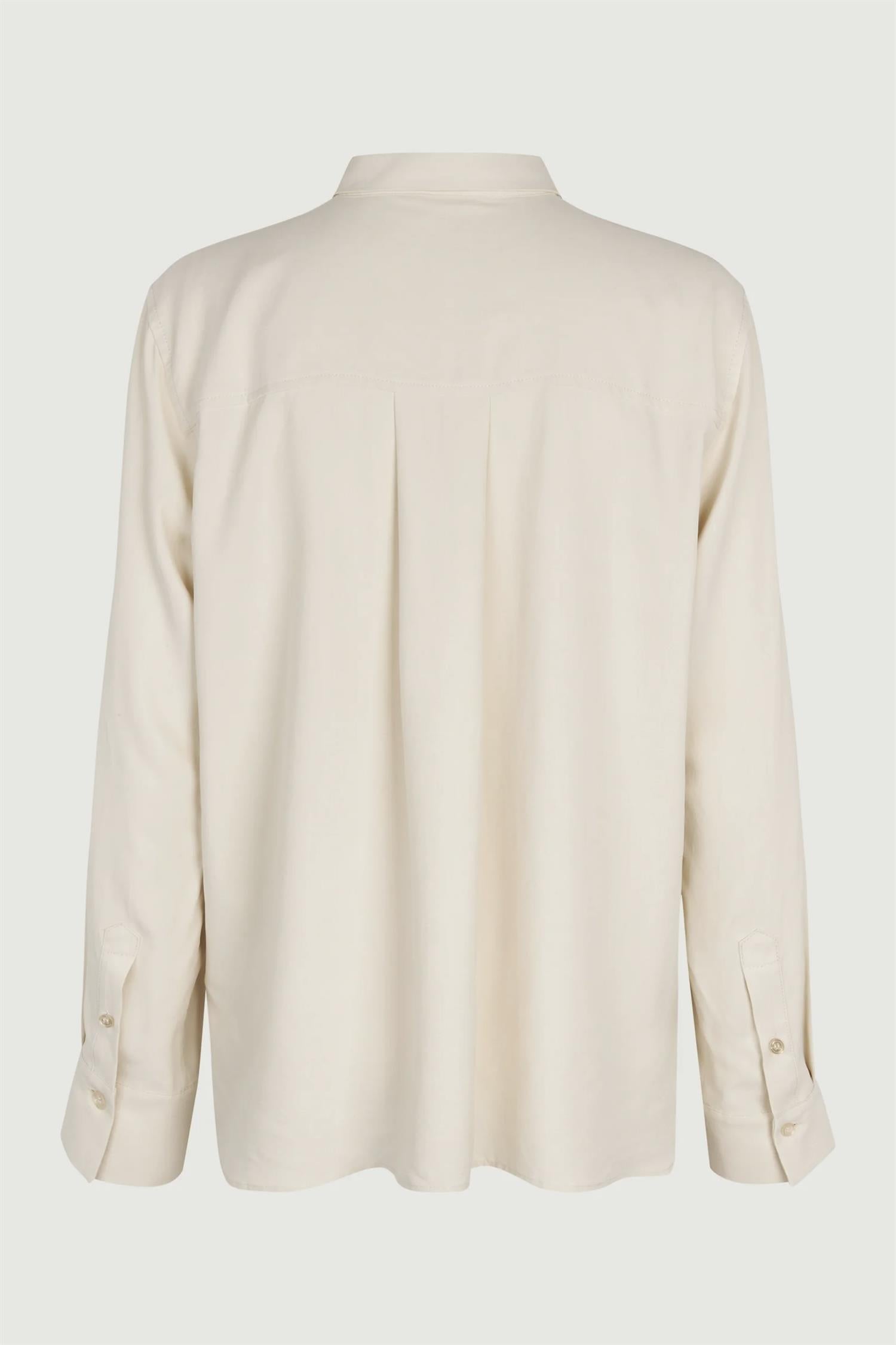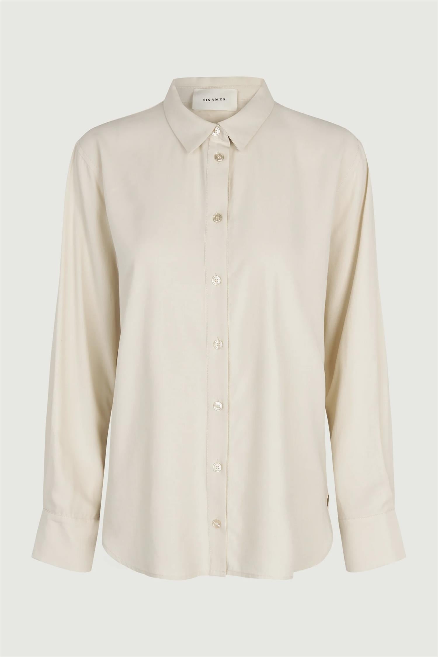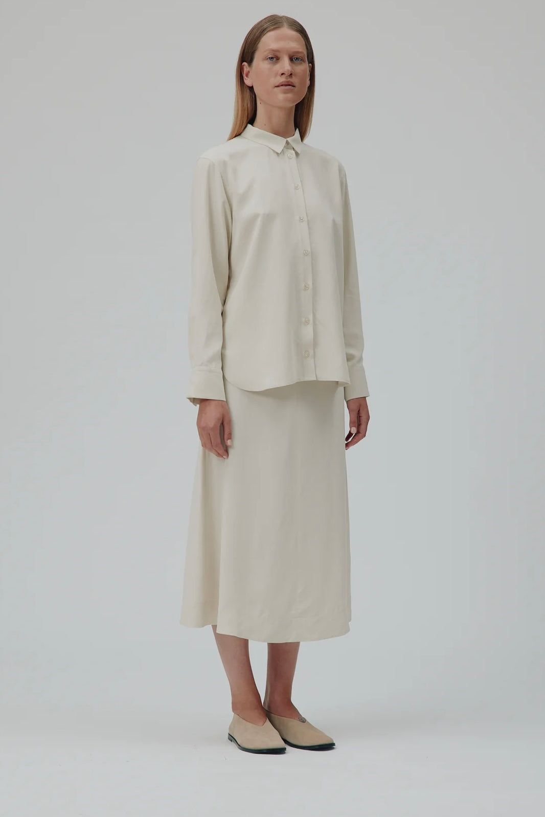 Ally er en skjorte med avslappet passform i 100 % spunnet silke. Den har skinnende knapper foran og i mansjettene, med en legg bak for diskret bevegelsesfrihet. Elegant og allsidig, den kan brukes under en strikkeplag eller alene for en uanstrengt stil.