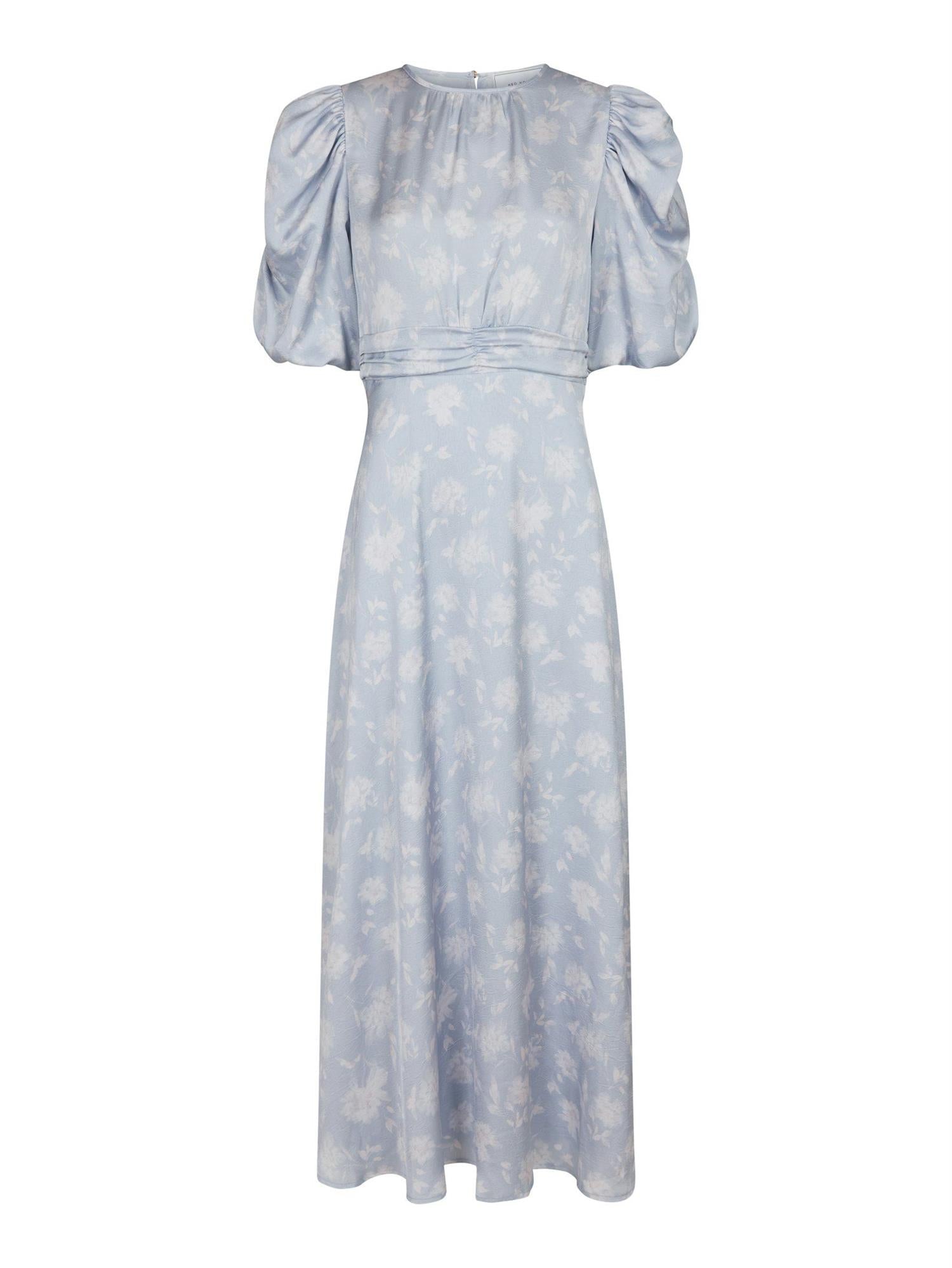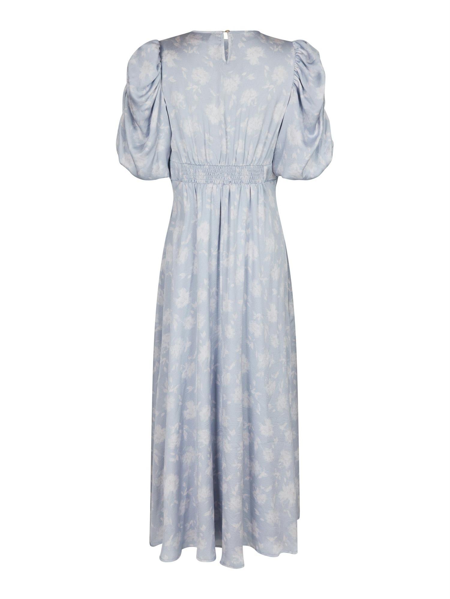 Nydelig, feminin lang kjole med et vakkert blomstermønster. Kjolen har 34-ermer og vaffelsøm bak i midjen. Kjolen har knappelukking i halsen.